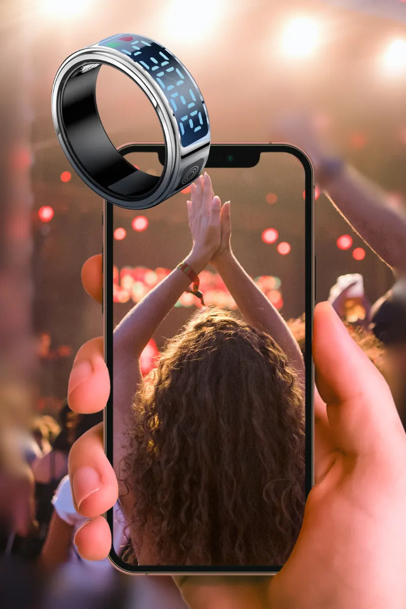 Experience wearable tech in a sleek form with this touchscreen smart ring featuring gesture control for your smart phone camera. Designed for style and functionality, it allows you to access key features like time, notifications, or health data with a tap or swipe. Compact and lightweight, at just 3 grams ans super thin at only 2.63 mm, this futuristic ring fits comfortably on your finger and is perfect for quick health and activity data at a glance.